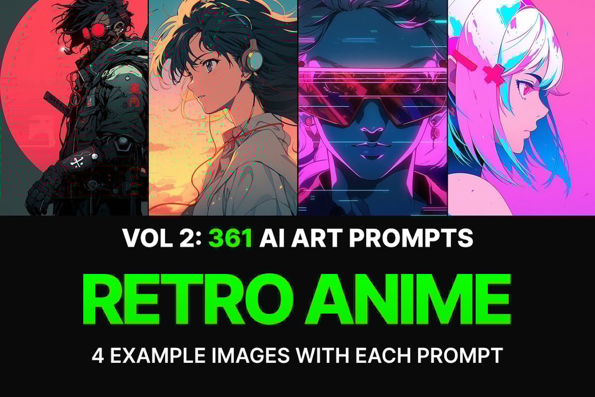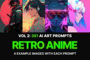 Transform your AI art with 361 customizable retro anime prompts featuring vibrant synthwave and nostalgic aesthetics.