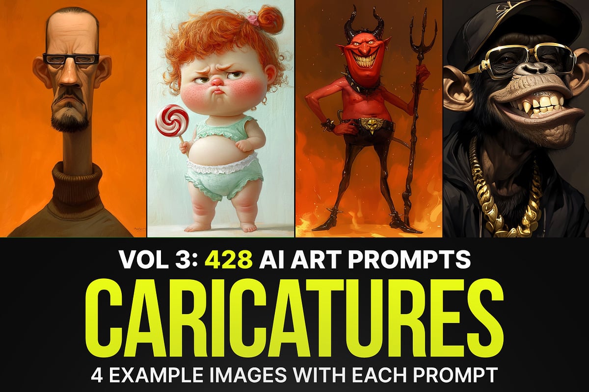 Create hilarious caricatures with 428 professionally crafted AI art prompts designed for maximum creative impact.