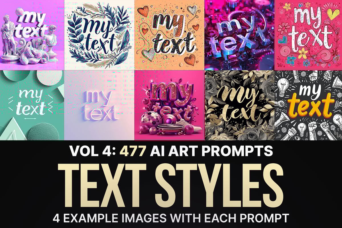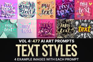 Create stunning text effects with 477 professional Midjourney prompts designed for typography and lettering styles.