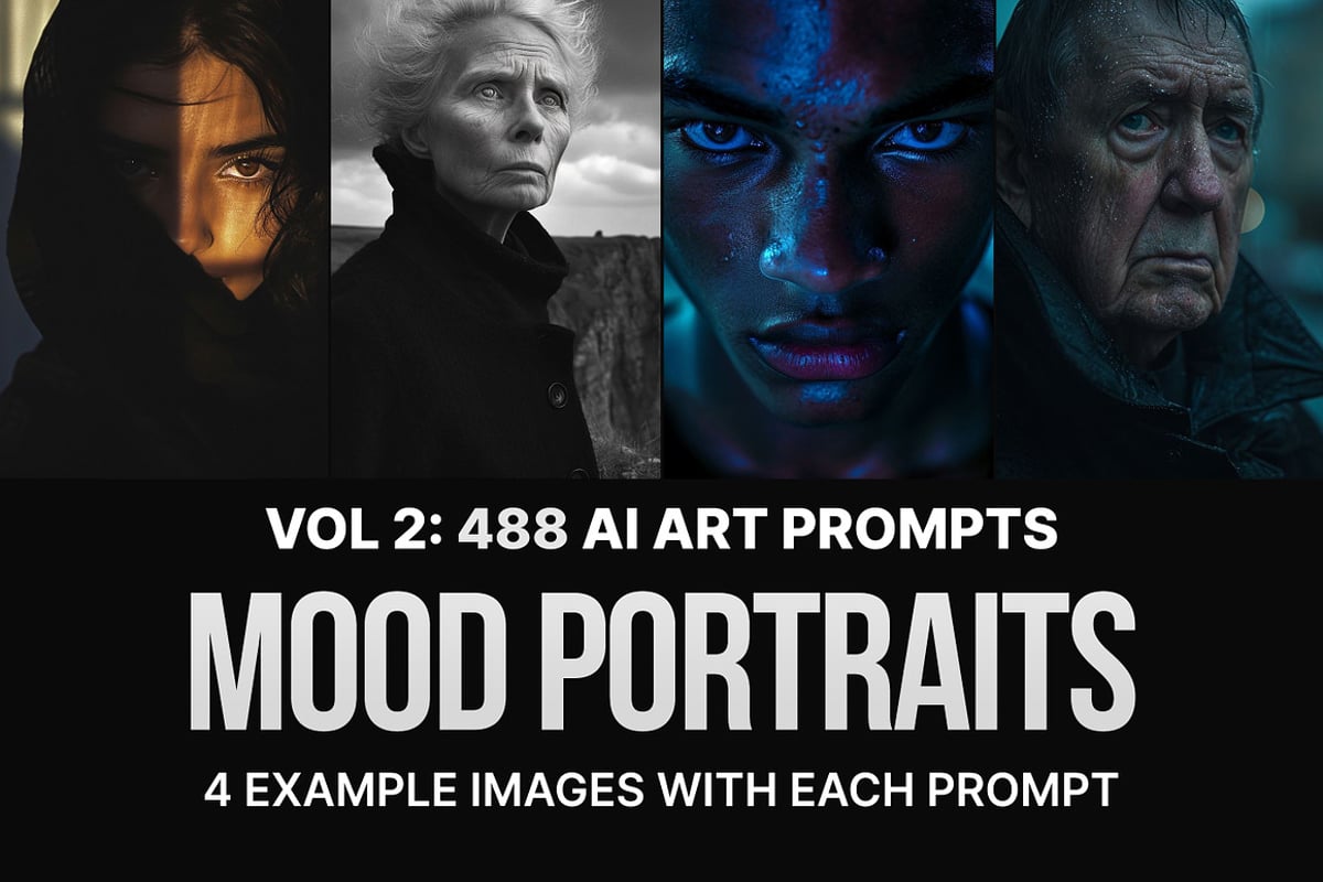 Create stunning mood-driven portraits with 488 professionally crafted AI prompts designed for dramatic storytelling.
