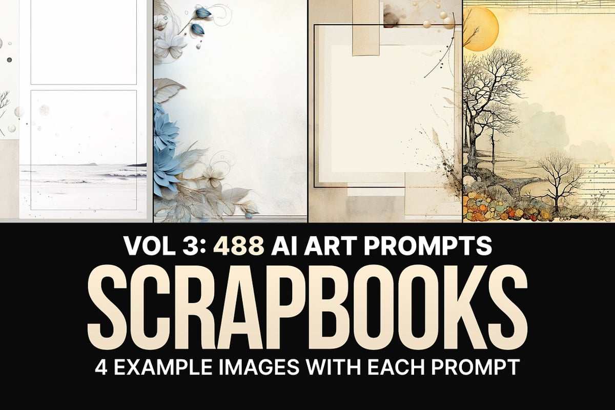 This comprehensive bundle contains 488 customizable Midjourney prompts specifically designed for scrapbook creation, volume 3 in the series.