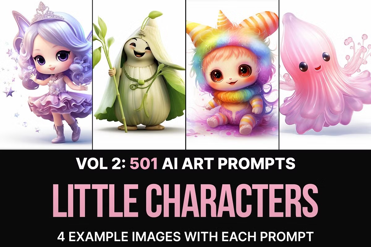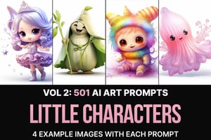 This comprehensive bundle contains 501 fully customizable Midjourney prompts specifically designed for creating charming little characters - this is volume 2 of the collection.
