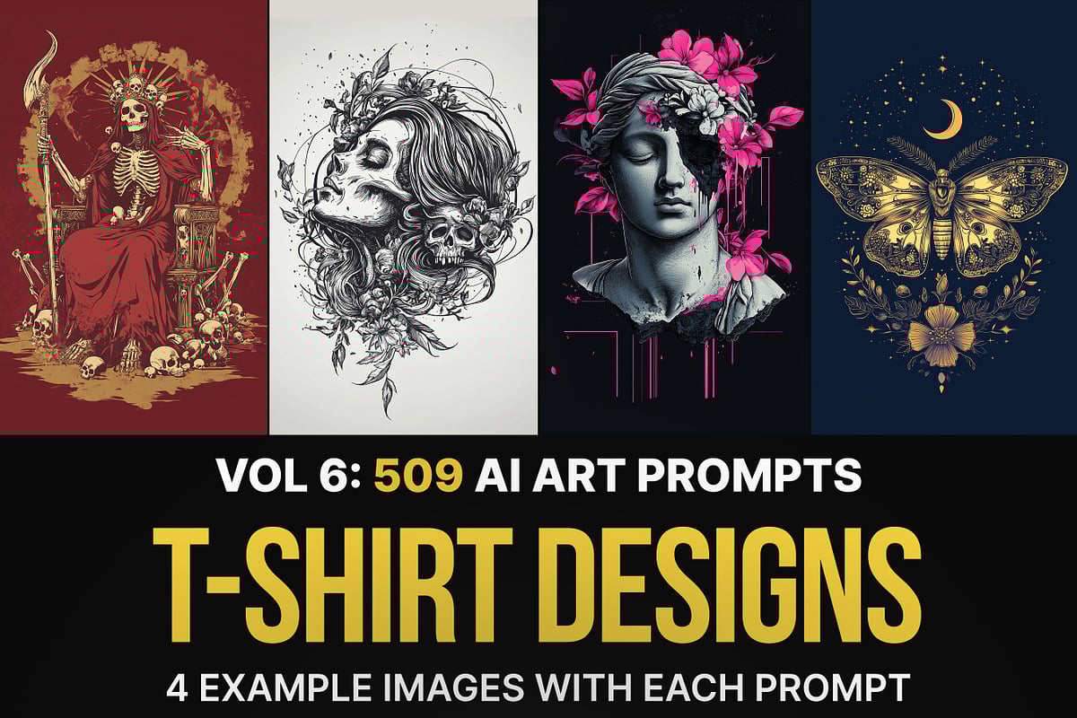 Transform your t-shirt designs with 509 expertly crafted AI art prompts featuring gothic, botanical, and mystical styles.