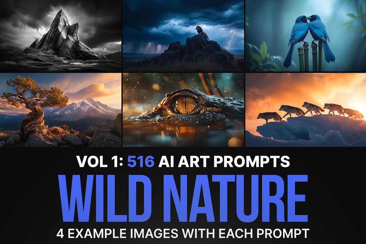 Transform your AI art with 516 professionally crafted wild nature prompts, each with 4 example images.