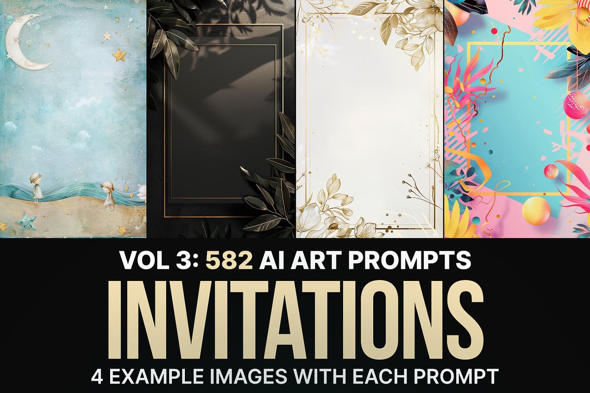 Generate stunning AI invitation designs with 582 unique Midjourney prompts - each with 4 example images included.