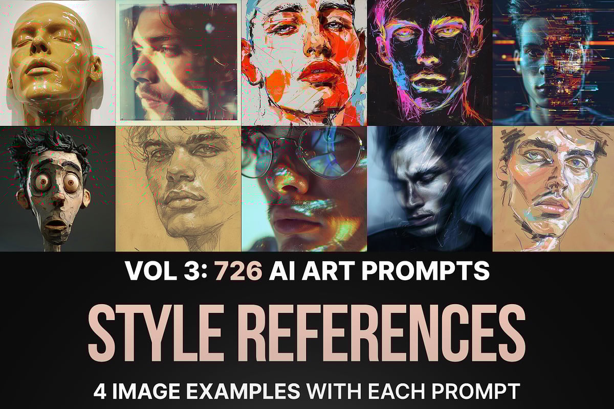 Transform your AI art with 726 expertly crafted style reference prompts featuring diverse portrait and character aesthetics.