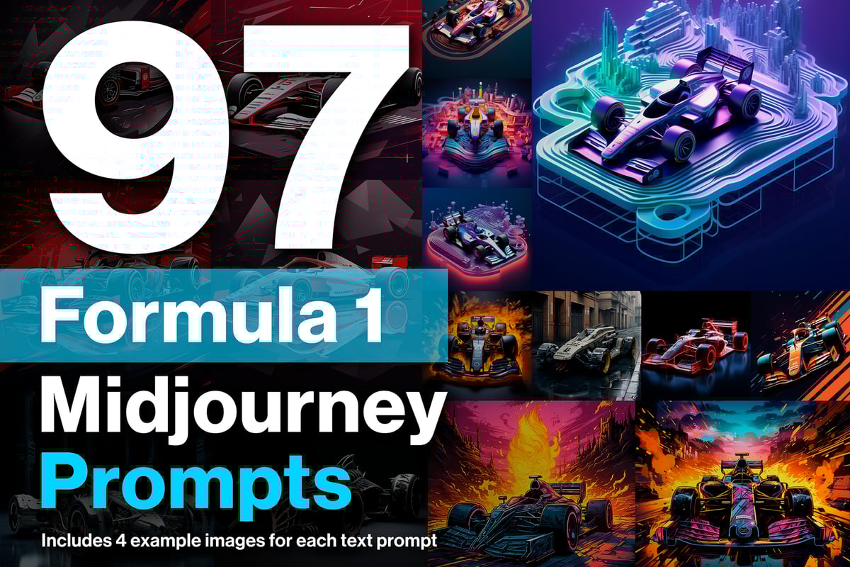 A bundle of 97 customizable Midjourney prompts for Formula 1