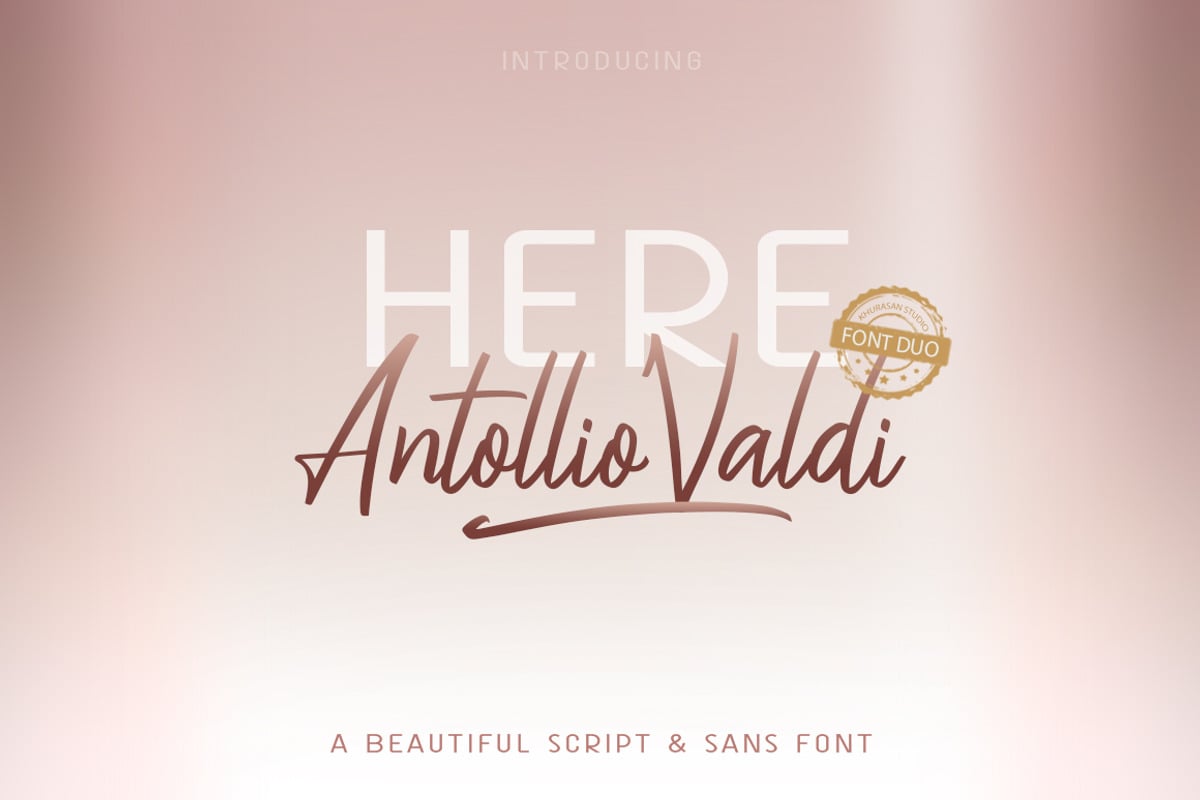 The Here Antollio Valdi Font delivers fresh, contemporary style by pairing an elegant script font with a clean sans serif typeface. Combine both styles to achieve truly amazing visual results in your creative projects.