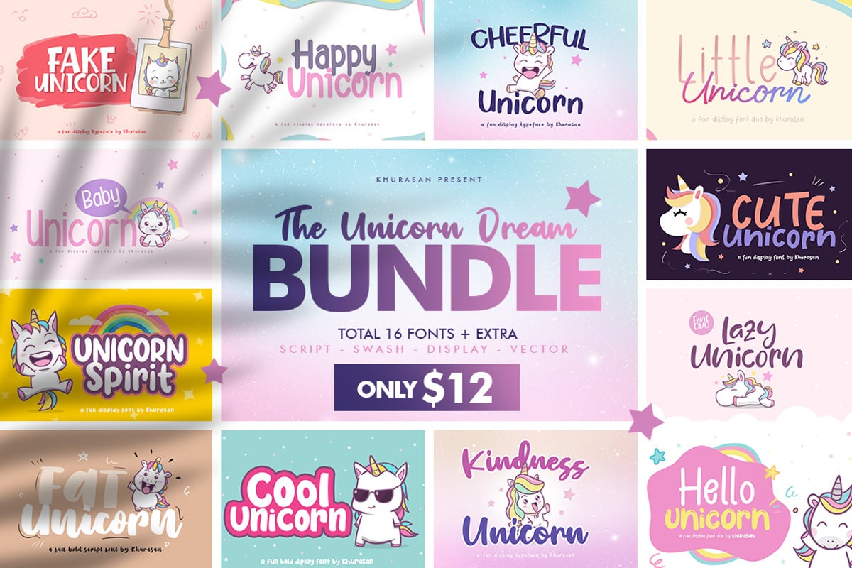 Get 16 magical unicorn-themed script fonts plus bonus vectors for just $12 - save 94% with this enchanting bundle!
