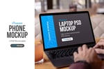 Showcase your digital designs in a warm, inviting cafe setting with this photorealistic laptop mockup.