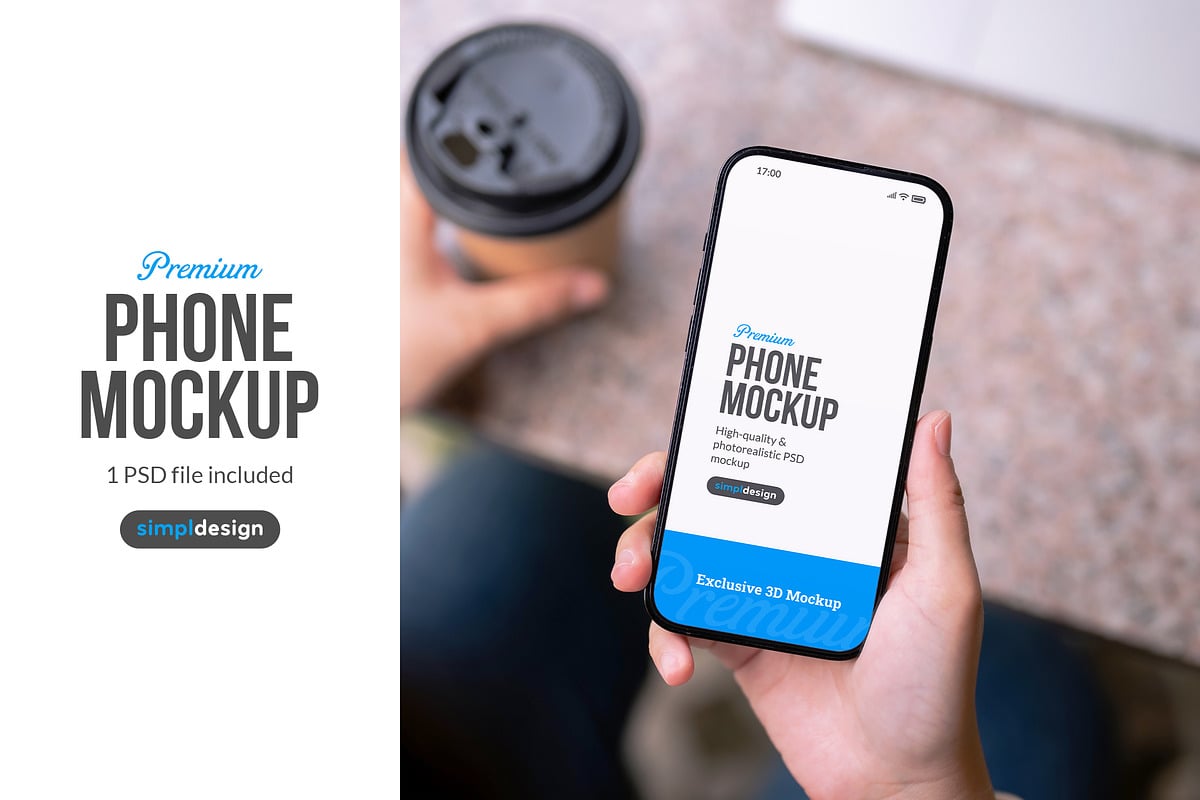 Showcase your mobile designs with this elegant coffee shop phone mockup featuring a woman's hand.
