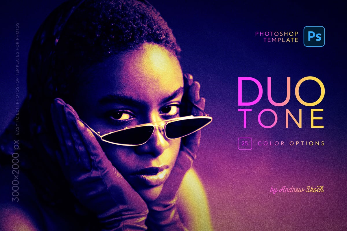 Give your photos a bold, modern look with this Duotone Grain Photoshop Template, featuring 25 vibrant color options and 3 customizable grain textures. Designed to evoke retro-futuristic aesthetics, this template is perfect for portraits, album covers, posters, and social media content.