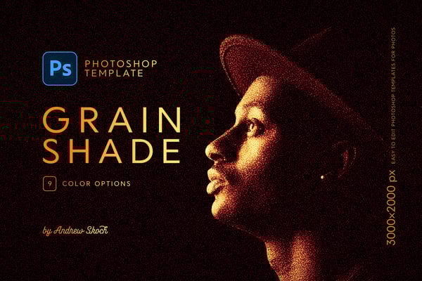 The fully editable PSD file lets you switch duotone color styles and grain levels with ease using Smart Objects and well-organized layers.