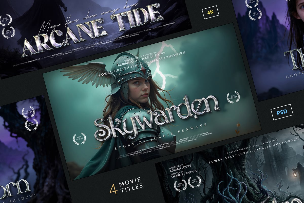 This Fantasy Movie Titles pack delivers 4 editable PSD templates inspired by legendary adventure films and mystical fantasy worlds. Each design showcases dramatic lighting effects, enchanting typography, and authentic film-poster aesthetics that instantly elevate your visuals to Hollywood standards.