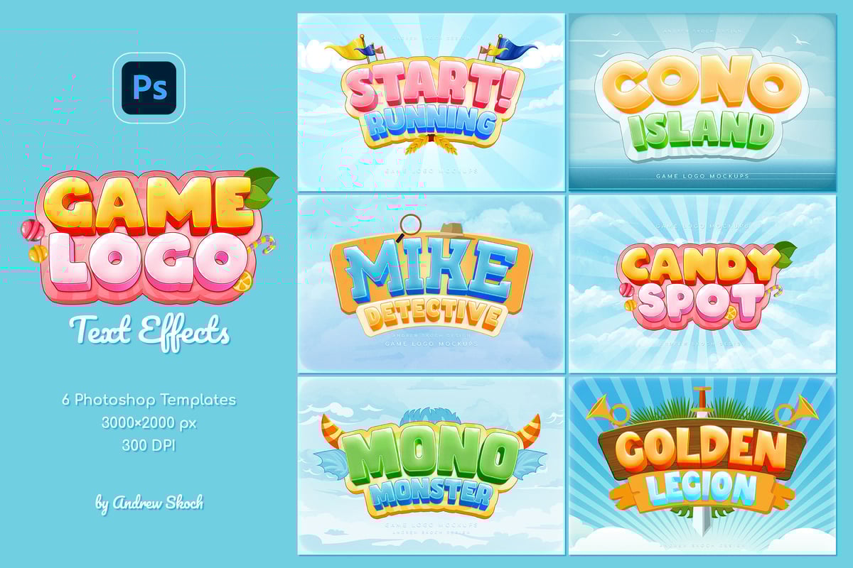 Get 6 Photoshop templates with game logos text effects. Cartoon style, vivid, tasty, candy letters are the best for funny mobile games. Colorful lettering for your game logos. Good for mobile gaming ui. Great way to present your mobile game in apps store. All texts are editable. Just edit text and all effects will be applied automatically.