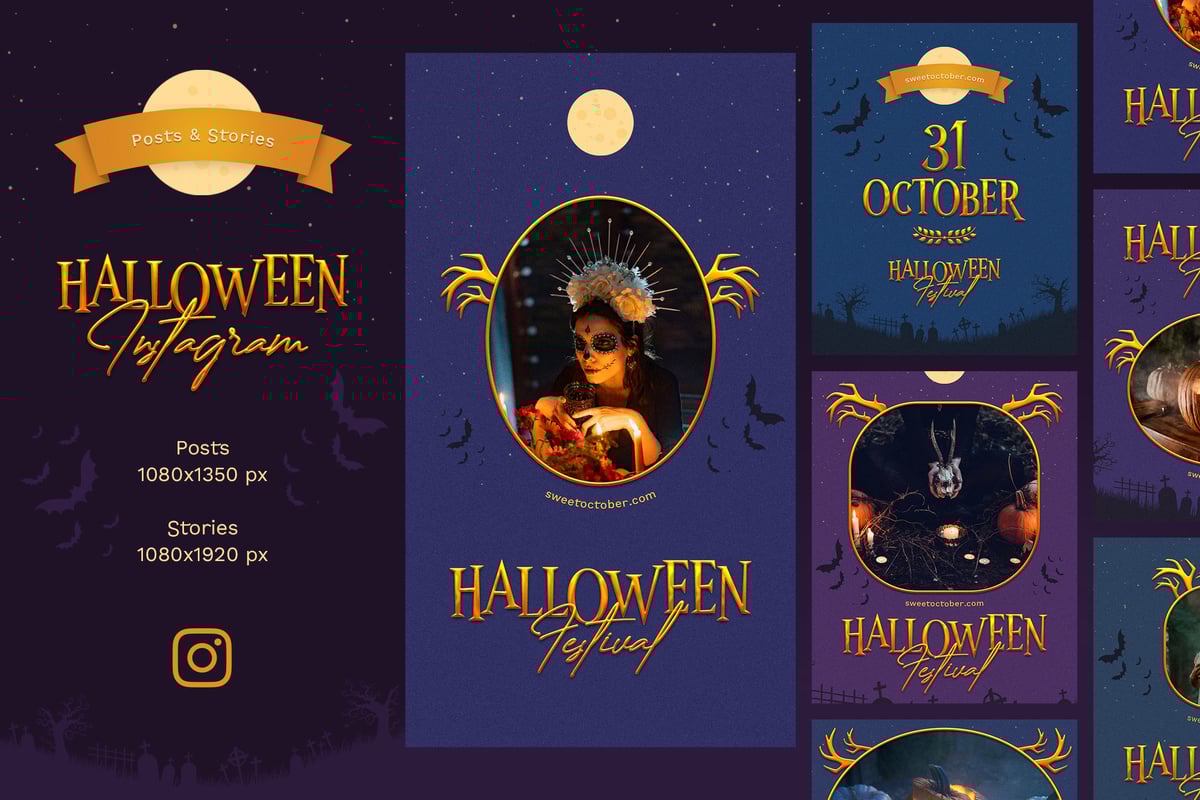 Be ready for Halloween with this set of 12 PSD templates. Posts and stories in dark and spooky style for your Halloween social media campaigns. Create Instagram stories within couple minutes! Also, suite for Facebook! Edit texts and put your photos. It's so easy!
