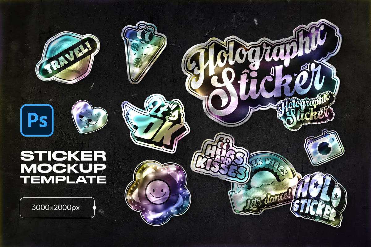 PSD template designed for showcasing sticker designs in a realistic holographic style. This mockup is easy to edit, allowing you to customize the sticker design and easily change the background to suit your needs. Whether you're a designer looking to present your sticker designs to clients or an artist showcasing your work online, this mockup is perfect for creating eye-catching presentations.