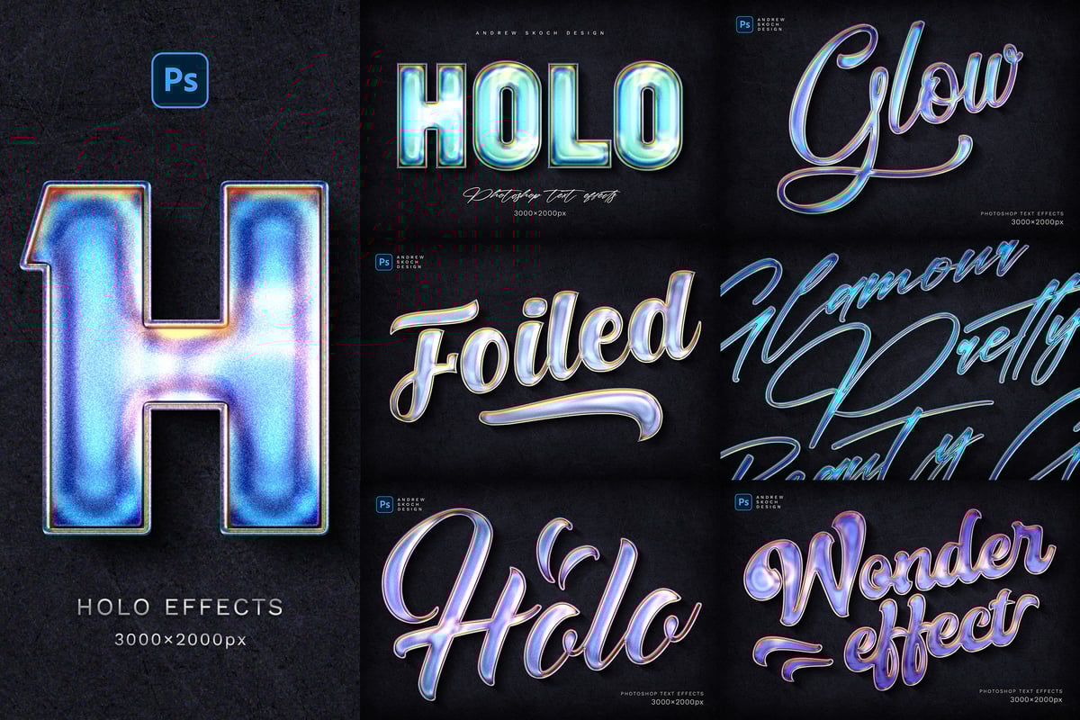 Be trendy with 6 shiny holographic effects. It’s an easy way to present your text, shape or logo in cool shining style. Textured holochrome letters with glowing holographic effect.