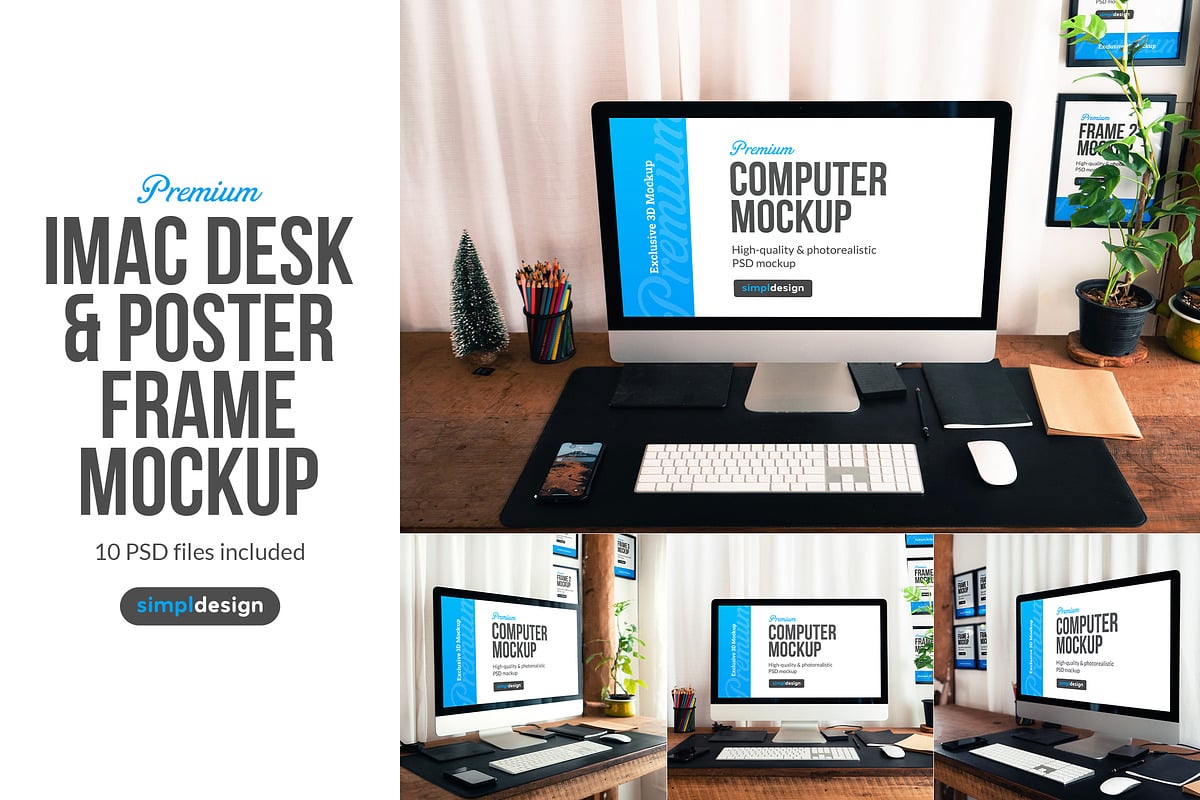 This comprehensive mockup collection includes 10 different versions of photorealistic iMac desk setups with poster frame arrangements. Each mockup delivers exceptional quality at 8823 x 5883 pixels resolution, perfect for professional presentations and portfolio displays.