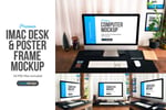 Showcase your screen and poster designs with professional iMac desk mockups featuring multiple poster frames.