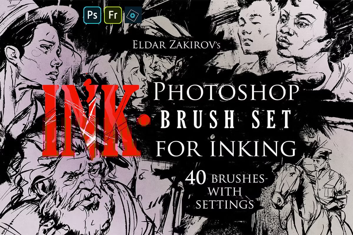 This set allows reaching the effects of drawing and writing with instruments filled with ink. I created it during two years-long work on an illustrative series for the dilogy book "Anisotropic Highway" and several ink-like inner spread illustrations for "Analog" magazine. This Brush Set is designed for Adobe Photoshop, but in fact, it may also be used in Photoshop Elements and Adobe FRESCO (except Brush #37). Working on those aforesaid graphic art pieces, I intended to reach the effect of drawing and writing with a nib and ruling pen, various brushes, and a homemade pen (also known as cola pen).
