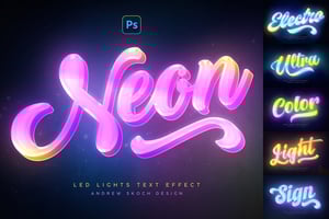 Illuminate your designs with the LED Lights Text Effects set! This collection of 6 Photoshop templates features realistic LED glowing effects with vibrant gradients, creating a stunning illuminated look. Designed with a magical dark background, these effects add depth and a futuristic touch to your text.
