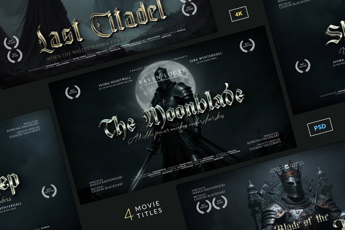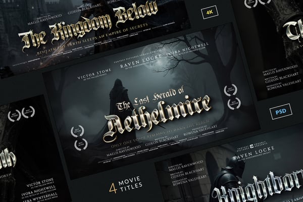Inspired by knights, ancient kingdoms, and cinematic dark fantasy films, these professionally crafted Photoshop templates showcase bold gothic typography, rich metallic depth, and dramatic lighting effects. Perfect for filmmakers, designers, and content creators who need high-end cinematic titles without the high-end budget.