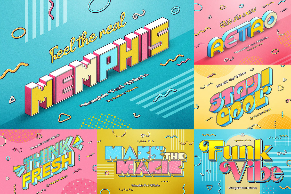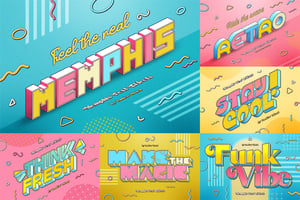 6 PSD templates featuring bold, playful letterings inspired by the vibrant Memphis design style. Each template offers unique compositions with dynamic color palettes and varied perspectives, including isometric and floating text views. Easily customize your designs with smart object replacement for fast and creative results.