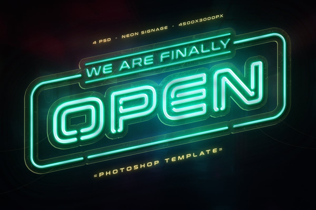 The Neon Signage - Pro Sign Master delivers a premium Photoshop toolkit engineered for professional-grade neon sign creation with exceptional realism. This comprehensive collection includes four expertly designed PSD templates that enable you to craft intricate, multi-color signage within a single project file. Every element is meticulously automated, from brilliant light tubes and internal gas illumination to authentic ambient light casting on backgrounds.