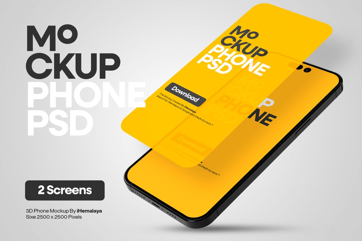 Showcase your UI/UX design with this realistic PSD mockup. This 3D phone mockup features 2 screens, the Original one and a floating screen for a modern and dynamic presentation.