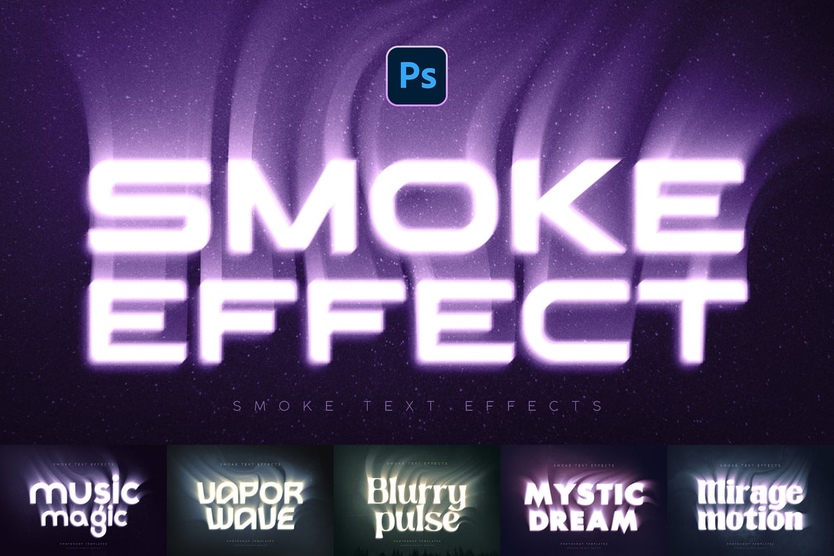 Create a mysterious, dramatic vibe with this collection of 6 Smoke Text Effects for Photoshop. Perfect for titles, headlines, or logos, each template features realistic smoky textures and colors to give your text a bold and atmospheric look.