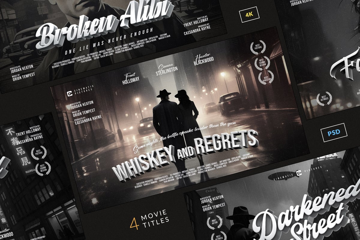 Capture the drama and elegance of classic cinema with Vintage Noir Titles – a set of 4 editable PSD templates inspired by the golden age of Hollywood. Designed with bold lettering, atmospheric contrasts, and cinematic layouts, these templates evoke the unforgettable mood of 1940s–1950s noir films.