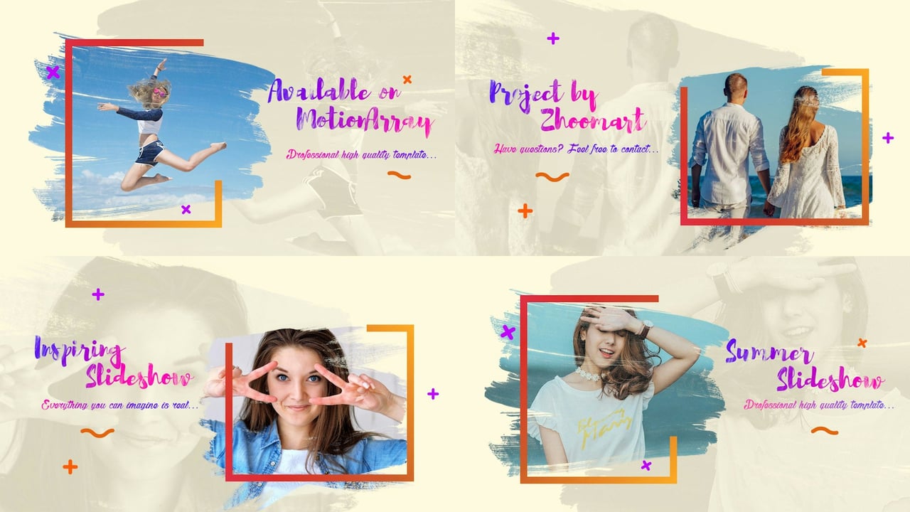 Create stunning summer memories with this vibrant Premiere Pro slideshow template featuring fun gradients and brush stroke reveals.