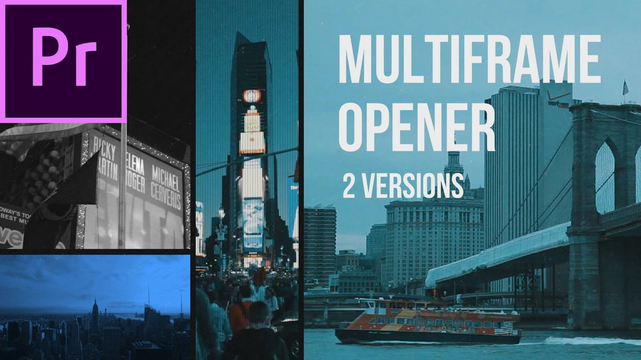 Multiframe Media Opener is a distinctive Premiere Pro template featuring an eye-catching design with dynamic text animations. The template showcases quick layouts with split screen effects and stylized color tints perfect for modern presentations.